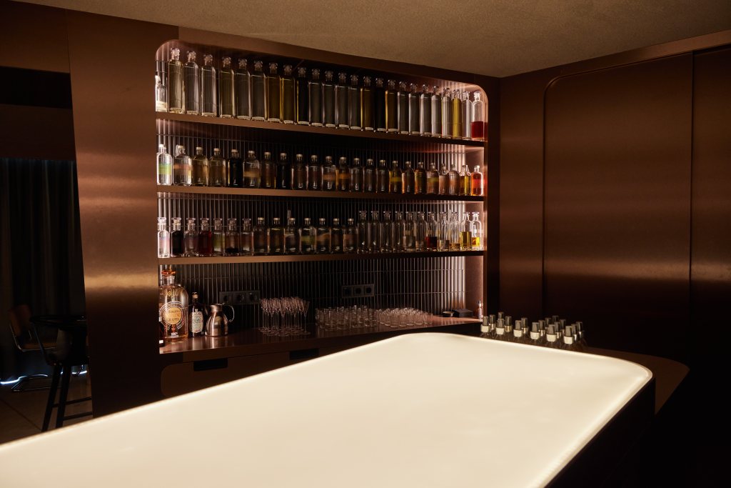 Al cor de Kyara hi ha la sala de composició: un espai impactant ple de destil·lats, extractes i acords aromàtics. És aquí on es formulen meticulosament els nostres còctels i on té lloc la Martini Diagnosis: una experiència de martini personalitzada segons el paladar de cada convidat.